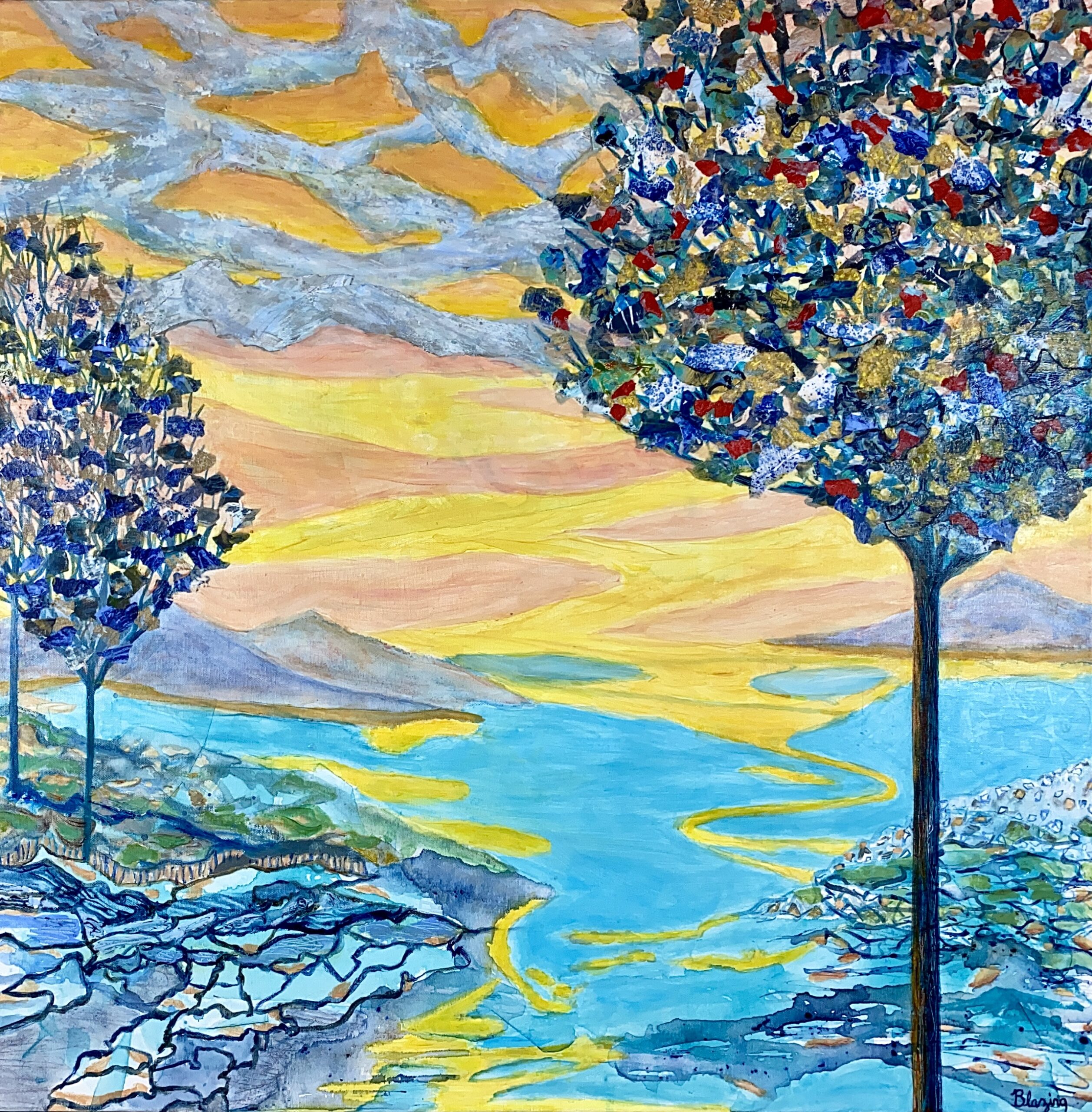 acrylic painting incorporating hand-painted original paper on stretched canvas
